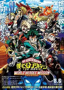 My Hero Academia: World Heroes' Mission (Japanese: 僕のヒーローアカデミア THE MOVIE ワールドヒーローズミッション, Hepburn: Boku no Hīrō Akademia Za Mūbī: Wārudo Hīrōzu Misshon) is a 2021 Japanese animated superhero film based on an original story featuring the characters of My Hero Academia manga series by Kōhei Horikoshi. Produced by Bones and distributed by Toho, the third film of the franchise is directed by Kenji Nagasaki from a script written by Yōsuke Kuroda and stars Daiki Yamashita, Nobuhiko Okamoto, and Yuki Kaji as part of an ensemble cast. In the film, taking place during the Endeavor Agency arc of the manga, Izuku Midoriya and his classmates join the Pro-Heroes around the world for a mission to stop a terrorist plan that will bring an end to humanity.