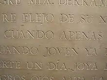 "Mi último adiós" is interpreted into 46 Philippine languages, including Filipino Sign Language,[7] and as of 2005 at least 35 English translations known and published (in print). The most popular English iteration is the 1911 translation of Charles Derbyshire and is inscribed on bronze. Also on bronze at the Rizal Park in Manila, but less known, is the 1944 one of novelist Nick Joaquin. The latest translation is in Czech by former Czech ambassador to the Republic of the Philippines, Jaroslav Ludva,[8] and addressed at the session of the Senát. In 1927, Luis G. Dato translated the poem, from Spanish to English, in rhymes. Dato called it "Mí último pensamiento".[9] Dato was the first Filipino to translate the poem.[10]