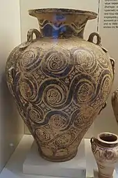 Where the first recognizably Mycenaean pottery emerged is still under debate. Some believe that this development took place in the northeast Peloponnese (probably in the vicinity of Mycenae). There is also evidence that suggests that the style appeared in the southern Peloponnese (probably Lanconia) as a result of the Minoan potters taking up residence at coastal sites along the Greek Mainland.[31]