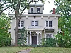 The Palmer House is a timber-framed, Italian Villa style two-story house on a fieldstone foundation. It is roughly cubical, with an L-shaped rear service wing. The walls are clad with flush siding, a fairly unusual feature in Michigan architecture. The house has a hip roof supported with paired brackets. Small decorative balconies are around many of the windows. A large flat-roofed cupola in the center of the roof was destroyed in a 1930 fire, and later rebuilt.[2]