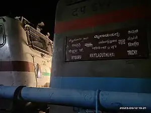 Few coaches of the train were amalgamated and bifurcated at Karur for Madurai, numbered as 6531A / 6532A. After changing the train number from 6531 / 6532 to 6231 / 6232, it was first extended to Mysore, then to Thanjavur and to Nagore.[3] On 29 June 2002, the train number was changed from 6231 / 6232 to 6831 / 6832 as the service was transferred from Mysore railway division to Tiruchirappalli Railway Division with stoppage at Maddur was cancelled.[4] The Tiruchi–Nagore service was trimmed for the execution of gauge conversion in the Tiruchi–Nagore section, sanctioned in 1995–1996 Railway Budget.[5] As the Tiruchi–Thanjavur part was completed in 1998, the service again extended back to Thanjavur.[3] After the completion of gauge conversion Thanjavur–Kumbakonam section in Chennai Egmore–Thanjavur line, Lalu Prasad Yadav, the then Railway Minister extended the service up to Kumbakonam,[6][7] which was effected since 9 January 2006 along with change in train number from 6831 / 6832 to 6231 / 6232.[8][9] Further, the service was extended up to Mayiladuthurai Junction,[10][11][12][13] and was effected since 17 June 2006.[14][15] The train number was changed from 6231 / 6232 to 16231 / 16232 since December 2010 onwards as a part of train management system over the entire Indian Railways network.[16][17] There is a constant demand from delta people to divert this train through Salem - Namakkal -Karur line for reduce the travel time and also the fare.