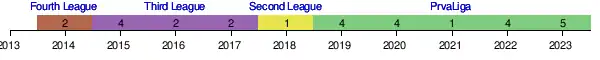| 2018–19 | 1. SNL | 4th | 13–13–10 | Semi-finals |