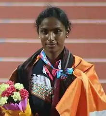 ![]() N.V. Sheena with her bronze medal in 2017 Women Triple Jump | |||||||||||||||