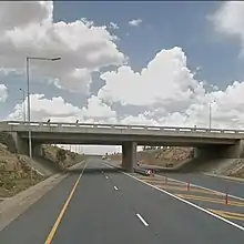 The N1 is designated as a toll road from the N6 interchange until its end at Beit Bridge. A few kilometres north of Bloemfontein, the N1 meets the R30 to Brandfort; the N1 continues as a single carriageway but with two lanes in each direction until 5 km before the toll plaza at Verkeerdevlei, halfway between Bloemfontein and Winburg. Initial plans were for the N1 from Bloemfontein to Winburg to be a dual-carriageway freeway. At Winburg, the N1 bypasses the town to the west as a dual carriageway and meets the western terminus of the N5, which bypasses the north of Lesotho before its own termination at the N3 in Harrismith.[1] Just after Winburg, the N1 becomes a single carriageway again.