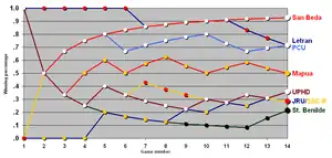 - The defending champions started off the season with a six-game winning streak and seemed poised to sweep the first round of the eliminations. Their final assignment in the first round was against the San Beda Red Lions, who are on a winning streak of their own after succumbing to PCU in their second game. The Red Lions, however came well prepared and jumped the gun on the Knights at the early goings and controlled the game all throughout, thus dealing the Knights their first loss of the season, with both teams sharing first place honors in the first round with an identical 6–1 win–loss records.