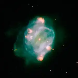 This is a Type IIb/III[8] planetary nebula with a low expansion velocity of 15 km/s.[9] The chemical abundances in the shell indicate that the progenitor had only undergone partial conversion of carbon into nitrogen when its life span came to an end.[9] The morphology shows point symmetry around the center. Overall it is rectangular in shape, and has two pairs of higher density knots that are symmetric around the middle, aligned along position angles of approximately 30° and 163°. These display a slightly enhanced abundance of nitrogen compared to the rest of the nebula and are photoionized on the side facing the central star.[8] The symmetrical shape of the nebula may have arisen from jets emerging from both sides of a disk about the central star.[10]