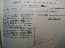 NKVD troika or Special troika (Russian: особая тройка, romanized: osobaya troyka), in Soviet history, were the People's Commissariat of Internal Affairs (NKVD which would later be the beginning of the KGB) made up of three officials who issued sentences to people after simplified, speedy investigations and without a public trial.[1] The three members were judge and jury, though they themselves did not carry out the sentences they dealt. These commissions were employed as instruments of extrajudicial punishment introduced to supplement the Soviet legal system with a means for quick and secret execution or imprisonment.[2] It began as an institution of the Cheka, then later became prominent again in the NKVD, when it was used during the Great Purge to execute many hundreds of thousands of Soviet citizens.[3] Defendants in the Troika's proceeding were typically not entitled to legal aid or the presumption of innocence. Convictions usually did not include information about the actual incriminating evidence and basically contained only information about indictment and sentencing. The outcome of such trials was often determined before it even began due to targeted numbers of citizens to be executed or imprisoned in Gulag prison camps.[4]