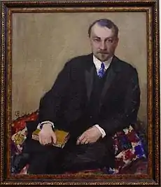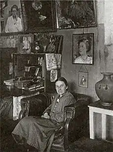 Nadezhda Sapozhnikova (Russian: Надежда Михайловна Сапожникова; 26 March 1877 – late autumn 1942) was a Russian painter and a maecenas. Sapozhnikova was born in a merchant family and received her education in Kazan. At the age of 27, Nadezhda started to practice painting. Together with her supervisor Nicolai Fechin Sapozhnikova travelled to Paris, where from 1910 to 1912 she studied in the studios of Antonio DeVity and Kees van Dongen. After returning to Kazan, Sapozhnikova opened her own studio and provided Fechin with financial support – she owned 11 of his works, including five portraits of her. Until 1925 Nadezhda taught painting and drawing in Kazan, then moved to Moscow. In the 1930s, she eventually finished her career as an artist. Up to now, only a few works of Sapozhnikova have been preserved; some of her paintings are exhibited at the National Gallery of Art "Hazine".