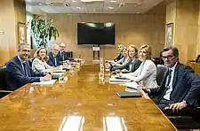 In June 2018 Calviño was chosen by Prime Minister Pedro Sánchez to be part of his new government as Minister of Economy and Business of Spain, following the motion of censure that the PSOE presented against the previous government of Mariano Rajoy (PP) and that was approved by the Congress of Deputies on 1 June 2018.[6] Thus, on 7 June she took office as Minister of Economy and Business before the King at Palace of Zarzuela.[7][8]