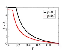 Above and to the right is a plot of the average velocity as a function of the density of cars, obtained from a simulation of the original Nagel–Schreckenberg model.[1] In the deterministic limit, p = 0, the velocity is constant at the maximum velocity (here 5) up to a density ρ = 1/(maximum velocity + 1) = 1 / 6 = 0.167, at which point there is a discontinuity in the slope due to the sudden appearance of traffic jams. Then as the density increases further, the average velocity decreases until it reaches zero when the road is 100% occupied. When p = 0.3, and so there are random decreases in velocity, then at low densities the average velocity is of course slower. However, note p > 0 also shifts the density at which jams appear to lower densities – traffic jams appear at the knee in the curve which for p = 0.3 is close to 0.15, and the random decelerations round off the discontinuity in the slope found for p = 0 at the onset of traffic jams.[2]