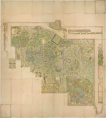 The Honmaru enceinte is in the centre of the complex, containing the main and minor keep, along with the palace. The Ninomaru enceinte is located to the east, the Nishinomaru to the west, the Ofukemaru, also known as the Fukaimaru, to the northwest, and the Sannomaru around the east and south. To the north was the Ofuke-niwa (御深井庭) or Ofuke-oniwa (御深井御庭). The Ofuke Garden was a pleasure garden centering on a large pond that was left over from the low marshland that existed on the north side of the castle when the castle was built, and served as a defense. The pond had a number of small islands and the area was cultivated as a Japanese garden.[14] This part became the public Meijō Park in 1931. Located west of the Ofuke Garden was lord Tokugawa Naritomo's Shin Goten (新御殿 New Palace) in what is today Horibata-chō (堀端町).[14]