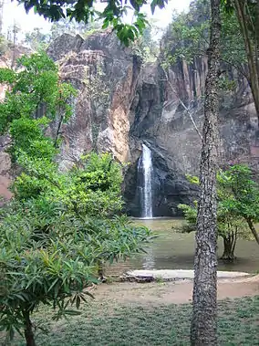 The Chat Trakan Waterfall, a.k.a. Pak Rong Waterfall, is located within the park. The sandy beach near the falls is suitable for swimming. Some of the cliffs near the falls are inscribed with yet unexplained rock carvings. The stream from the waterfall joins the Phak River.[5]