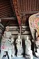 Along with nearby Foguang Temple, Nanchan Temple contains original sculptures dating from the Tang dynasty. The hall contains seventeen statues and are lined up on an inverted U-shaped dais.[4] The largest statue is of Sakyamuni, placed in the center of the hall sitting cross-legged on a sumeru throne adorned with sculpted images of a lion and demigod. Above the large halo behind the statue are sculpted representations of lotus flowers, celestial beings and mythical birds. Flanking him on each side are attendant bodhisattvas with a knee placed on a lotus. A large statue of Samantabhadra riding an elephant is at the far left of the hall and a large statue of Manjushri riding a lion is on the far left. There are also statues of two of Sakyamuni's disciples (Ānanda and Mahākāśyapa), two statues of heavenly kings and four statues of attendants.[5]