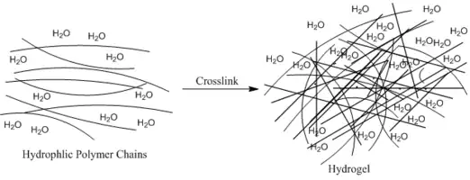 The hydrogel structure consists of cross-linked hydrophilic polymer chains. A semi-permeable membrane or a homogeneous solid mass encapsulate cells. Natural and synthetic hydrogels are used to encapsulate the cells. Algae and sodium alginate provide a commonly used source for polysaccharides. Other natural biomaterials utilized include agarose and chitosan. Synthetic biomaterials include poly(ethylene glycol) (PEG) and polyvinyl alcohol (PVA). Prior to initiation, the biomaterials exist as a liquid monomer. The biomaterials are mixed with cells. Once initiated by pH, temperature, ionic strength, or light control, the biomaterials self-assembles into a solid polymer meshwork. Since the cells are mixed before initiation, this allows for the fabrication of the nano-scaffold construct, and cell seeding in one step. This method contains low mechanical properties due to the highly moldable structure of the nano-scaffold and is not ideal for load-bearing applications.