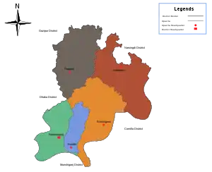 - Narayanganj, Fatullah, Baidyabazar, Rupganj and Araihazar upazilas of Dhaka district