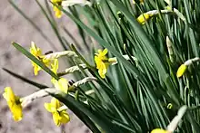 Narcissus 'Sun Disc' is a dwarf variety of daffodil. It is a bulbous perennial, which emerges in the Spring.[4] Plants possess strap-like, green leaves and reach a maximum height of 15cm tall.[4] Each mature bulb can produce a single stem, which can host from 1 to 3 flowers.[4] Flowers are rounded, flat and 50mm wide.[2] Blooms can possess either yellow or white petals, however the corona is short and always yellow.[2]