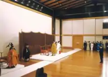 The newly married Crown Prince Naruhito and Crown Princess Masako in Japanese traditional attire, with the Prince wearing a sokutai, the Princess a jūnihitoe, 1993