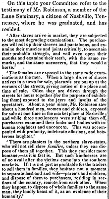 "My first mistress sold me because I was stubborn. She sent me to the 'slave yard' at Nashville. The yard was full of slaves. I stayed there two weeks before Master Simpson bought me. I was sold away from my husband and I never saw him again. I had one child which I took with me...The slave yard was on Cedar Street...A Mr. Chandler would bid the slaves off, but before they started bidding you had to take all of your clothes off and roll down the hill so they could see that you didn't have no bones broken, or sores on you. (I wouldn't take mine off.) If nobody bid on you, you was took to the slave mart and sold. I was sold here. A bunch of them was sent to Mississippi and they had their ankles fastened together and they had to walk while the traders rode.