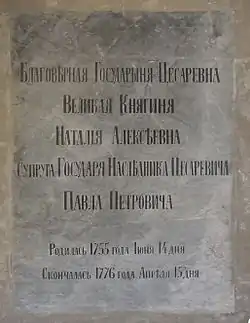 Natalia Alexeievna, Tsarevna of Russia (25 June 1755 – 26 April 1776) was the first wife of Paul Petrovich, Tsarevich of Russia (future Emperor Paul I), son of the Empress Catherine II. She was born as Princess Wilhelmina Louisa of Hesse-Darmstadt as the fifth child of Louis IX, Landgrave of Hesse-Darmstadt and his spouse Countess Palatine Caroline of Zweibrücken.