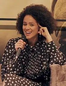 The following year, she was cast as Missandei, Daenerys Targaryen's interpreter, in HBO's fantasy drama series Game of Thrones.[11] In an interview with Jimmy Kimmel, she confirmed that she received the news about winning the role when she was working in a clothes store as a shop assistant.[15] In 2015, Emmanuel was promoted to a regular cast member on the show.[16] Missandei was the only prominent character that was a woman of colour in the show, and her death scene, which took place whilst she was in chains, was unpopular among fans, being called an example of fridging and evoking an image of slavery.[17][18] Emmanuel later told The Guardian:[19]