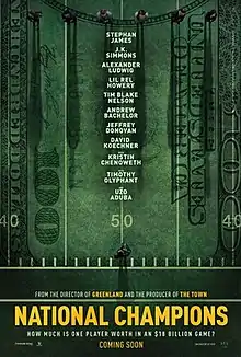 National Champions is a 2021 American sports drama film directed by Ric Roman Waugh, based on the play of the same name by Adam Mervis. The film stars Stephan James, J. K. Simmons, Alexander Ludwig, Lil Rel Howery, Tim Blake Nelson, Andrew Bachelor, Jeffrey Donovan, David Koechner, Kristin Chenoweth, Timothy Olyphant, and Uzo Aduba.