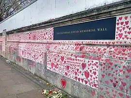 The National Covid Memorial Wall in London is a public mural painted by volunteers to commemorate victims of the COVID-19 pandemic in the United Kingdom.[1] Started in March 2021 and stretching more than one-third mile (five hundred metres) along the South Bank of the River Thames, opposite the Palace of Westminster,[2] the mural consists of approximately 220,000 red and pink hearts, one for each of the casualties of COVID-19 in the United Kingdom who died with COVID-19 on their death certificate.[3] The intent was for each heart to be "individually hand-painted; utterly unique, just like the loved ones we’ve lost".[4]