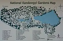 The National Kandawgyi Botanical Gardens (Burmese: ကန်တော်ကြီး အမျိုးသား ရုက္ခဗေဒ ဥယျာဉ်; formerly National Botanical Gardens) is a 177 hectare botanical garden located in the Alpine town of Pyin U Lwin (formerly Maymyo), Burma, situated at an elevation of 1000 metres (3,605 ft) and 69 km (43 mi) by road from Mandalay.[1] The current official name is National Kandawgyi Garden.