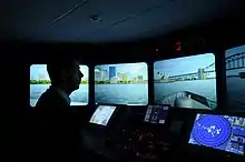 There is also a fire-fighting training simulator (designed to reflect hazards found on ships), radio (GMDSS) training suites, bridge simulation equipment (including a 360° bridge watchkeeping simulator), and engine room simulation equipment.[16] In additional to machinery room equipment (diesel engines and boilers) used for familiarisation and training, there are several workshops and laboratories.[16]