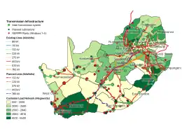 At the 2019 State of the Nation Address, President Ramaphosa announced that Eskom would be unbundled into three wholly-owned entities; namely, Generation, Transmission and Distribution.[1] In 2020, Eskom began establishing independent boards and directors. On 17 December 2021, Eskom legally transferred its transmission division to the National Transmission Company of South Africa;[2] 374 transmission lines with a total length of 33 199 km, 500 three-phase transformers with a total capacity of 159 384 MVA located at 169 transmission substations were transferred to the NTCSA.[3]