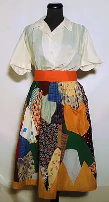 At the request of the Netherlands Information Bureau (NIB), Boissevain-van Lennep travelled to the United States in 1949, visiting 27 states and championing the "Magic Skirts of Reconstruction".[3] Her preferred nickname was "levensrok" (skirt of life) while others in the Netherlands used "bevrijdingsrok" (liberation skirt) or "oranjerok" (orange skirt, referring to the House of Orange, the reigning Dutch royal family).[1] Each had one or more triangles sewn near the front hem on which the date of the Dutch Liberation Day, 5 May 1945, was embroidered; some also had the dates of later celebrations in which the makers participated.[4][5] Prominent among the colours in these feestrok were the Dutch national colours: red, white, blue, and orange.[5] The skirts were individually registered in a national archive under the names of their makers, and their identification number was often embroidered into the skirt itself.[4]