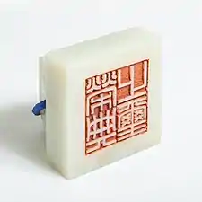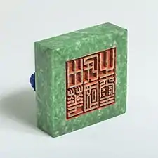 The Seal of the Republic of China is made of green jadeite and weighs 3.2 kilograms (7.1 lb). It is 10 centimetres (3.9 in) in height, with 4.3 cm being the height of the body. The face of the seal is 13.3 cm square. Its inscription 中華民國之璽 is written in seal script in vertical writing, with 中華, 民國 and 之璽 written from right to left. The national emblem (Blue Sky with a White Sun) is engraved on top of the knob, decorated with a sapphire blue silk cordon.[1]