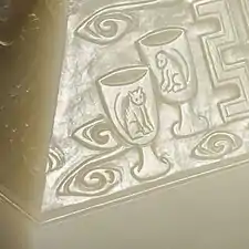 Special care is to be taken when using the national seal, which is done in the form of rubbing rather than stamping. To mark documents, they are placed face-up, then the faces are covered with cinnabar oil ink. The document is then placed face-down on the face of the seal, and then pressure is applied evenly on the back of the sheet.[1][9][12]