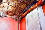 The Chinese Classroom is inspired by the design of a palace hall in Beijing's Forbidden City and is dedicated to the memory of Confucius and his democratic ideal of classless education. The teacher and students sit at the same level around a moon-shaped teakwood table. The professor's chair is carved with the admonition to "Teach by inspiring gradually and steadily". A slate portrait of Confucius is present that is patterned after one in the Confucian temple at his birthplace of Qufu in Shandong Province. Above the red lacquered door, Chinese characters are carved into the stone lintel that proclaim that "Humility of mind goes with loftiness of character." Stone lions flank the entrance before carvings of the plum blossom, the national flower of China. The ceiling contains a coiling golden five-clawed imperial dragon surrounded by clouds denoting nature's energy and freedom. Painted squares portray dragons guarding the pearl of wisdom and the phoenix with the motan flower, a symbol of cultural wealth. The opened blackboard doors reveal painted renditions of the babao, or Eight Treasures, popular in Chinese art. On the base below is a carved version of the Bagua which consists of eight trigrams surrounding the circular Yin and Yang. Windows consist of frosted glass with stylized cames.