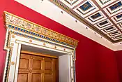 The Austrian Nationality Room represents the 18th-century era of the Austrian Empire during its age of enlightenment under Empress Maria Theresa and her son Joseph II and incorporates Baroque elements of the Haydnsaal in Schloss Esterházy at Eisenstadt where Joseph Haydn served as Kapellmeister from 1766 to 1778. Ceiling paintings depict scenes from Roman mythology similar to those in the Haydnsaal. The room features Lobmeyer crystal chandeliers, gilded white lacquer seminar furniture patterned after that in the formal dining hall of Vienna's Hofburg, royal red-tapestried walls, gold-leafed pilasters, and a parquet floor inlaid in a starburst design. Exhibits in the display cases in the room trace the development of the multinational Austrian Empire and the birthplaces of representative Austrian composers born within its borders between the years 1000 and 1918.