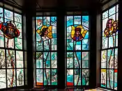 The German Classroom was designed by German-born architect Frank A. Linder to reflect the 16th century German Renaissance as exemplified in the Alte Aula (Great Hall) of the University of Heidelberg. The woodwork of the room was done by German-born Philadelphia decorator Gustav Ketterer and includes walnut paneling framing the blackboards, columns carved with arabesques flanking the two entrance doorways, and support broken-arch pediments surmounted by carved polychromed crests of the two oldest German universities: Heidelberg (1386) and Leipzig (1409). The doors are mounted with ornate wrought-iron hinges and locks, and their upper panels are decorated with intarsia depicting the central square of Nürnberg on the front door and the fountain of Rothenburg on the rear door. Carved in the architrave above the paneling are the names of famous philosophers, poets, musicians, artists, and scientists. The intarsia doors of the four corner cabinets feature tales from German folklore including Parsifal who searched for the Holy Grail, Siegfried who was the hero of the Nibelungenlied, the maiden wooed in Goethe's poem Heidenröslein, and Lorelei who was the golden-haired Rhine maiden whose song lured sailors to destruction. Painted on the escutcheon above the front blackboard are words from Friedrich Schiller's Das Ideal und das Leben, "Stern endeavor, which no arduous task can shake, to the hidden fount of true attains." The rear wall has a quotation from Johann Wolfgang von Goethe's Was wir bringen which reads: "Great mastery results from wise restraint, and law alone points the way to liberty." Furniture includes the professor's leather upholstered chair stands on a small platform behind a burled walnut table and student tablet armchairs are walnut with scroll backs. Wrought-iron chandeliers are the work of German craftsman. The display case contains gifts of artworks and books from Germany's Ministry of Education. The stained-glass windows were designed by master stained glass artist Charles Connick, however they were not completed until 1953 by Connick protege Frances Van Arsdale Skinner.[24] The windows depict characters in the Grimm Brothers' fairy tales such as Little Red Riding Hood, Snow White and the Seven Dwarfs, Hansel and Gretel, and Cinderella.[31]