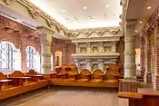 The Armenian Classroom[19] was inspired by the 10th- to 12th-century Sanahin Monastery. The design consists of intersecting arches and a domed ceiling built to lessen damage from frequent earthquakes in that country. The room's arches, built of Indiana limestone, make this the heaviest of the Nationality Rooms, weighing 22 tons, and required the second floor beneath the room to be reinforced in order to support its weight. The cornerstone is a basalt stone from the grounds of Sanahin. In the mortar behind it are the thumbprints of five of the oldest Armenian diaspora living in the Pittsburgh area, as well as the handprint of an infant of Armenian descent, symbolizing the continuity of the Armenian presence in western Pennsylvania.