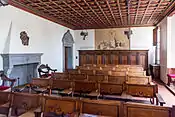 The English Classroom is designed in the Tudor-Gothic style after the House of Commons that was rebuilt by Sir Charles Barry following the fire of 1834. The English Classroom is the largest of the Nationality Rooms and incorporates several original items given as gifts from the British Government from the damaged House of Commons, whose Chamber was completely destroyed, following its bombing by the Luftwaffe in 1941, including the stone fireplace, hearth tiles, linenfold oak paneling, entrance doorframe, lintel, and corbels. The fireplace is from the Commons' "Aye Lobby", so named because members walk through it to vote "yes" to a bill, and is marked with the initials V.R. for Victoria Regina. The cast-iron fireback and andirons commemorate the defeat of the Spanish Armada in 1588 and an inscription above the fireplace is from Shakespeare's King Richard II and uses lettering adapted from the letter tiles originally designed for medieval paving by the Monks of Chertsey Abbey in Surrey. The inscription reads: "Set in the silver sea.....this blessed plot, this earth, this realm, this England." Above the doorway hangs a royal coat of arms made in 1688 during the reign of King James II. The linenfold paneling itself arrived at the University still having a blackened coat from the bombing.[27] Under the ceiling trusses are four carved limestone corbels from the House of Commons that are carved with a Tudor rose. Two corbels remain uncarved to emphasize the original carved corbels. The window frames, set in limestone, are characteristic of the Tudor period, and contain old imported glass, seeded and tinted, and encased in small, diamond-shaped leaded frames. Stained-glass window medallions depict the coats of arms of English towns and cities, literary and political figures, scholars of the Universities of Cambridge and Oxford, and the Houses of Lords and Commons. Portraits of University of Pittsburgh alumnus and former Ambassador to the Court of St. James's, Andrew Mellon, and the former Earl of Chatham, William Pitt, after whom the City was named, flank the stained glass windows in the rear bay. A brick from 10 Downing Street serves as the room's cornerstone. The white oak floor is fitted together with wooden peg dowels. Tudor-Gothic oak benches resemble the old House of Commons benches and are similarly arranged. Two English oak tables with melon-shaped legs stand before the bay. Two House of Commons Library chairs upholstered in green leather and bearing the official gold crest featuring the portcullis and crown were a gift of Lord Alfred Bossom and were rebuilt using wood from actual chairs in the bombed House of Commons.[28][29]