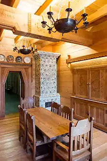 The Early American Room is one of two display rooms not used as a functional classroom, although it is opened for guided tours. The room was commissioned by longtime University Pittsburgh trustee George Hubbard Clapp, a descendant nine generations removed from Roger Clapp, an English captain who sailed into the New England port of Hull on May 30, 1630. The kitchen-living room of the early colonists was chosen to portray the sturdy simplicity of life in America during the 1650s.[21] The room's focus is a nine-foot fireplace constructed from 200-year-old handmade bricks with "fixings" of a log hook, heavy iron kettles, a spider, gridiron, longhandled waffle iron, bread shovel, skewers, ladles, and forks. A small recess in the brick wall served to bake bread. A tapered pole swings out from the end of the fireplace to be used for drying laundry or to hang a quilt to keep the cold draft from those gathered near the fire. Massive hand-hewn pine beams used in the seven-foot-high ceiling and the fireplace were collected after a careful search in Massachusetts. White pine is used for the heavy seminar table, benches, and chairs.[22] Wrought-iron candelabra are hinged with clasps to hold lighting tapers. Other light fixtures are of specially designed pierced tin.[23] The colonial-style windows were designed by glass artist Charles Connick.[24] Decorative items include a collection of 17th- and 18th-century American coins, a working spinning wheel, and a hand-stitched sampler. The small closet between the blackboard and fireplace contains a secret panel and once the concealed latch is discovered, its release causes the wall to swing open, revealing a hidden staircase to the upper loft, which has been furnished as a 19th-century bedroom. Included in the bedroom is a four-poster rope bed and small cradle, both of which belonged to pianist and composer Ethelbert Nevin. The bedroom also includes several personal items, including an 1878 wedding quilt, which belonged to Waitman Worthington McDaniel and his wife Martha Jane Poe, the grandmother of Nationality Director Maxine Bruhns.[25] The room is associated with various stories of unexplained incidents that have resulted in claims that the room is haunted.[25][26]