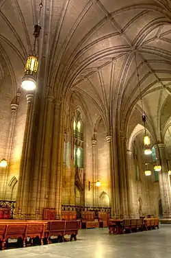 The Nationality Rooms are a group of 31 classrooms in the University of Pittsburgh's Cathedral of Learning depicting and donated by the national and ethnic groups that helped build the city of Pittsburgh. The rooms are designated as a Pittsburgh History and Landmarks Foundation historical landmark and are located on the 1st and 3rd floors of the Cathedral of Learning, itself a national historic landmark,[4][5] on the University of Pittsburgh's main campus in the Oakland neighborhood of Pittsburgh, Pennsylvania, United States. Although of museum caliber, 29 of the 31 rooms are used as daily classrooms by University of Pittsburgh faculty and students, while the other two (the Early American and Syrian-Lebanon) are display rooms viewed through glass doors, utilized primarily for special events, and can only be explored via special guided tour. The Nationality Rooms also serve in a vigorous program of intercultural involvement and exchange in which the original organizing committees for the rooms remain as participants and which includes a program of annual student scholarship to facilitate study abroad.[6] In addition, the Nationality Rooms inspire lectures, seminars, concerts exhibitions, and social events which focus on the various heritages and traditions of the nations represented. The national, traditional, and religious holidays of the nations represented are celebrated on campus and the rooms are appropriately decorated to reflect these occasions. The Nationality Rooms are available daily for public tours as long as the particular room is not being used for a class or other university function.[7]