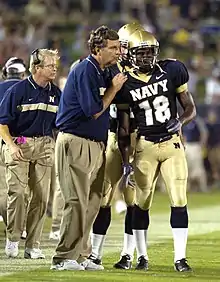 Utah State head coach Charlie Weatherbie was hired to replace Chaump in 1995.[67] Under Weatherbie, Navy did have a couple of winning seasons, the first coming in 1996 with a record of 9–3 with a win in the Aloha Bowl.[68][69] That was followed with a 7–4 campaign the following year.[70] After that, however, Navy struggled, failing to post a record better than a 5–7 record. After a 1–10 season in 2000[71] followed by an 0–7 start to the 2001 season,[72] Weatherbie was fired.[73]