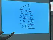 In 1893, Nazario wrote a piece named Escritura Aborigen de Carib (English: "Aboriginal writing of the Carib"), where he detailed his interpretations of the petroglyphs.[4][lower-alpha 2] Analyzing the inscriptions, he dismissed a Taíno or Arawak origin and by 1897 had concluded that the carvings were more reminiscent of Chaldean or Hebrew languages, saying that he recognized some of the characters present.[12] Nazario also asserted that based on the study of the petroglyphs, it was safe to conclude that the Pre-Columbian inhabitants of Puerto Rico had perfected writing beyond the natives of Mexico or Peru, speculating that the pieces could have been a Pre-Columbian national archive of some kind.[11] Nazario would then begin an effort to translate the characters phonetically after acquiring a copy of 1889's Historia De Las Naciones: Caldea (English: "History of the Nations: Chaldea") and using the characters present in a Babylonian religious artifact reproduced there.[4] The document would be modified and later become known as Escritura Fonética de los Indios de Puerto Rico (English: "Phonetic orthography of the Indians of Puerto Rico").[4] Nazario hypothesized that perceived linguistic similarities could imply that some of the Ten Lost Tribes crossed Asia making their way into the Bering Strait and traveled from there to North America, before dividing somewhere near Central America, from where they arrived to the Caribbean.[4]