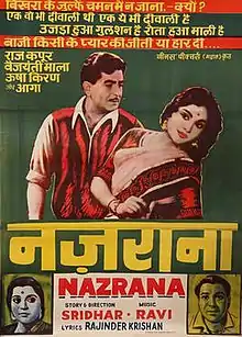 Nazrana (transl. Gift) is a 1961 Indian black-and-white Hindi-language melodrama film produced by S. Krishnamurthy and T. Govindarajan and directed by C. V. Sridhar in his Hindi directorial debut. The film stars Raj Kapoor, Vyjayanthimala, Usha Kiran in love triangle, while South Star Gemini Ganeshan has an extended cameo appearance.[1] The music is by Ravi. The Mohammed Rafi song "Baazi Kisi Ne Pyar Ki Jeeti Ya Haar Di", which was picturised on Raj Kapoor and it was one of the popular sad songs of that era.
