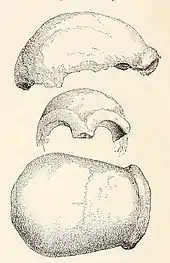 The 19th century discussion first focused on the question of how the anthropological findings had to be reconciled with characteristics of Homo sapiens. Already Johann Carl Fuhlrott had noticed the unusual massiveness of the bones, the highly trained bumps, ridges and ledges that supported the attachment of vigorously trained muscles.[26] One of the humerus had, according to his observation a healed injury. William King also referred to the unusual thickness of the skeletal bones, agreeing with Schaaffhausen, who had also evaluated the strongly rounded shape of the ribs and thus a quite unusual thorax for a human.[27] King mainly concentrated on the construction of the preserved skull bones. He described the shape as to be "stretched oval" and about an inch longer than that of a recent British person. The width of the skull, however hardly surpassed the width of modern man. As Schaaffhausen before him, King described the forehead region as unusually flat, fleeing and "excessively developed" bone strips above the eyes. In his synopsis of characteristics, that deviated from modern humans, King wrote: