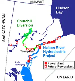 Powerplants (existing and planned) of the Nelson River Hydroelectric Project, Manitoba, Canada (2006). The Churchill Diversion diverts part of the Churchill at South Indian Lake south into the Rat River branch of the Burntwood River.