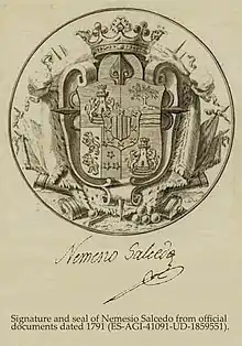 Born into a noble family with a great military tradition, Nemesio was son of Manuel Salcedo Varela and Agustina Serralta Salcedo. Due to his family's nobility and long tradition of loyal service to the Kings of Spain, a special royal dispensation was granted enabling him, whilst still a minor, to enter as a cadet in the Regiment of Royal Spanish Guards, by May 1, 1761. Salcedo was a native of Bilbao in Spain. He was the brother of Juan Manuel de Salcedo, the last governor of Spanish Louisiana,[1] and the uncle of Manuel María de Salcedo, governor of Spanish Texas.