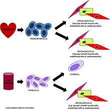 The human heart has been thought of as a postmitotic organ. Cardiomyocytes (muscle cells of the heart) were thought to be terminally differentiated cells that were irreplaceable and thus required to maintain cardiac function throughout life. However it is now known that the heart is able to regenerate new small vessels needed to repair an ischemic (lacking blood) myocardium. The belief that humans are born with a fixed number of cardiomyocytes, and that the growth of these cells was directly responsible for the growth of the heart, has also been disproven.[3] Reports of the heart's ability to repair itself have started to appear in peer reviewed journals[4] and a paper has been published that has shown the potential of bone marrow cells to regenerate myocardium (myogenesis).[5] Other studies into the regeneration of myocardium have reported evidence of angiogenesis,[6] although such studies have been found to contain discrepancies.[7]