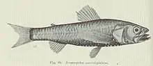 Neoscopelus macrolepidotus, also known as a large-scaled lantern fish, is a species of small mesopelagic or bathypelagic fish of the family Neoscopelidae, which contains six species total along three genera.[1] The family Neoscopelidae is one of the two families of the order Myctophiformes. Neoscopelidae can be classified by the presence of an adipose fin. The presence of photophores, or light-producing organs, further classify the species into the genus Neoscopelus.[2] N. macrolepidotus tends to be mesopelagic until the individuals become large adults, which is when they settle down to the bathypelagic zone.[2]