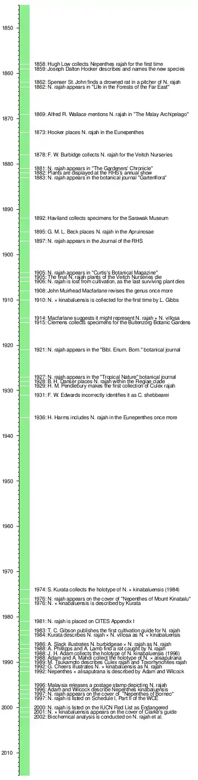 The species was collected by Hugh Low on Mount Kinabalu in 1858, and described the next year by Joseph Dalton Hooker, who named it after James Brooke, the first White Rajah of Sarawak. Hooker called it "one of the most striking vegetable productions hither-to discovered".[4] Since being introduced into cultivation in 1881, Nepenthes rajah has always been a much sought-after species. For a long time, the plant was seldom seen in private collections due to its rarity, price, and specialised growing requirements. However, recent advances in tissue culture technology have resulted in prices falling dramatically, and N. rajah is now relatively widespread in cultivation.