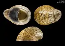 The color of the shell is dark brown.[8] The coloration has also purplish and greenish spiral bands.[8] Algae or silt are on periostracum usually.[8]
