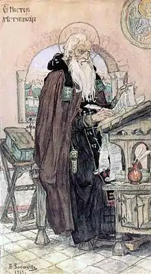 ![]() Iconographic depiction of St. Nestor the Chronicler, 1919, Viktor Vasnetsov (St Volodymyr's Cathedral, Kyiv). | |